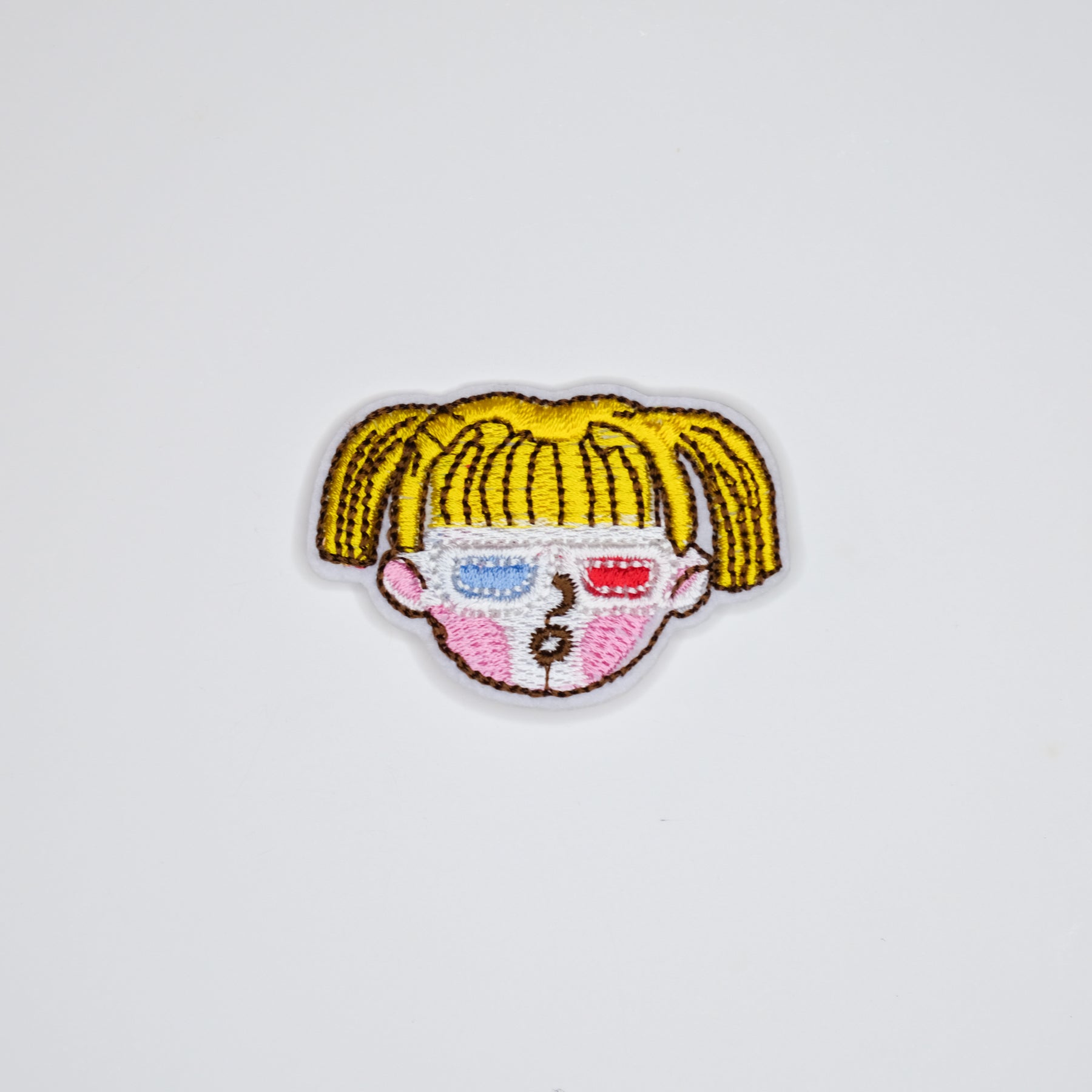 - Cute, embroidered design featuring a girl with pigtails, 3D glasses, and blushed cheeks