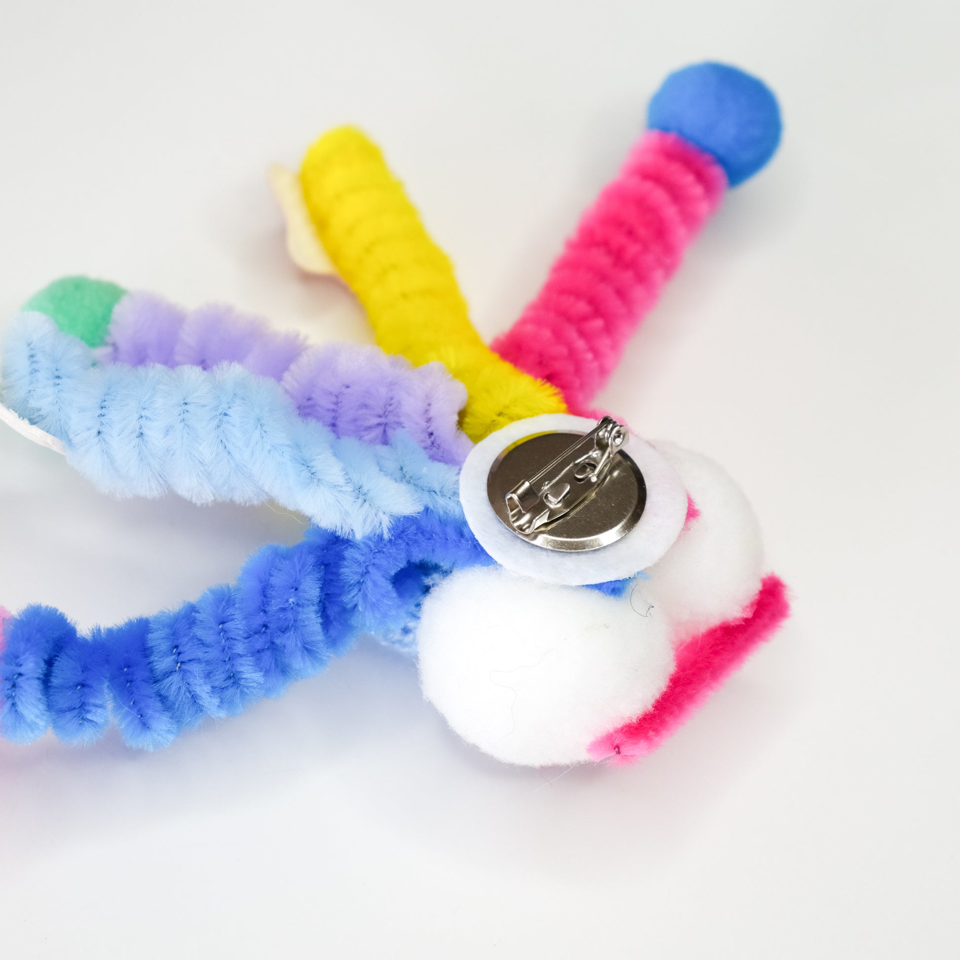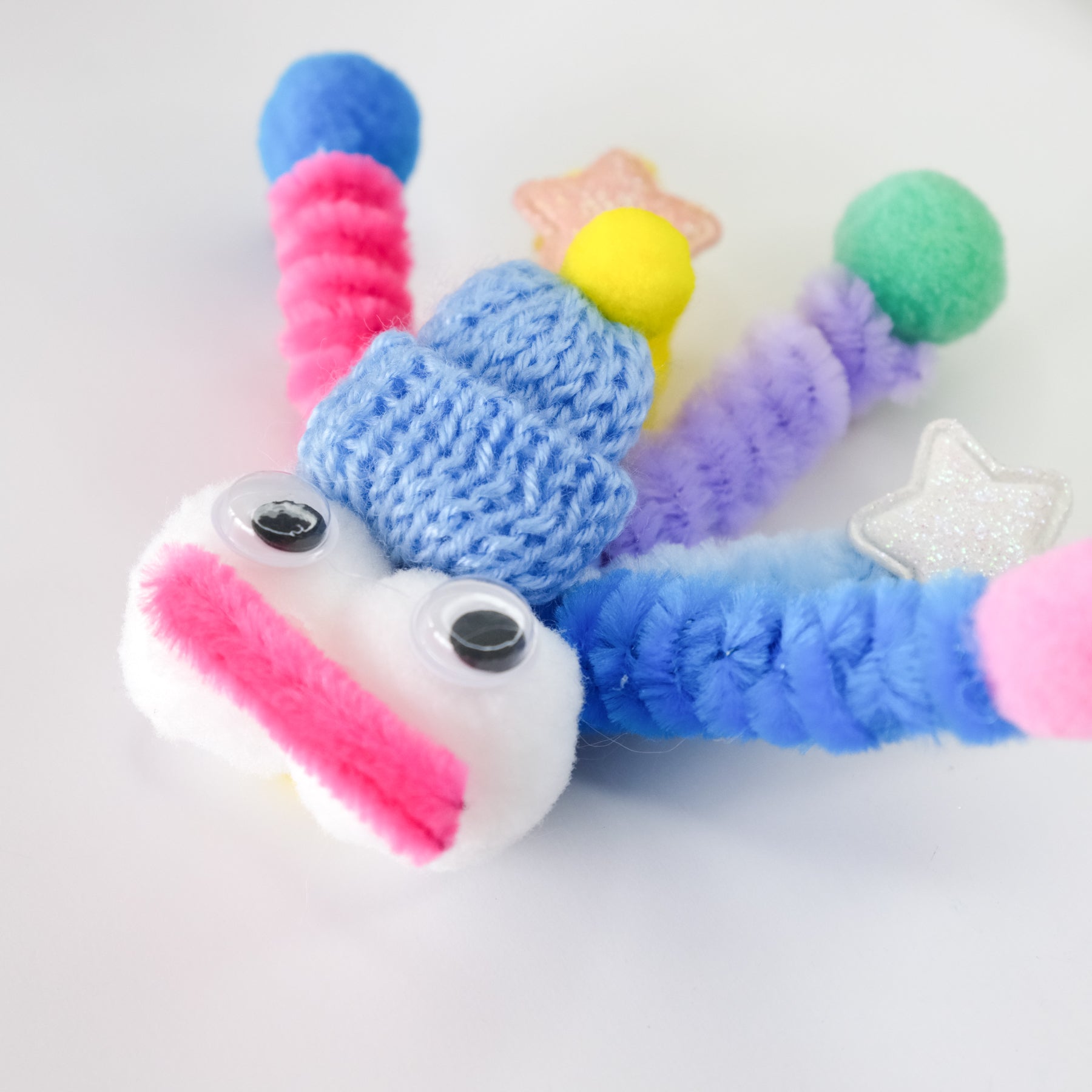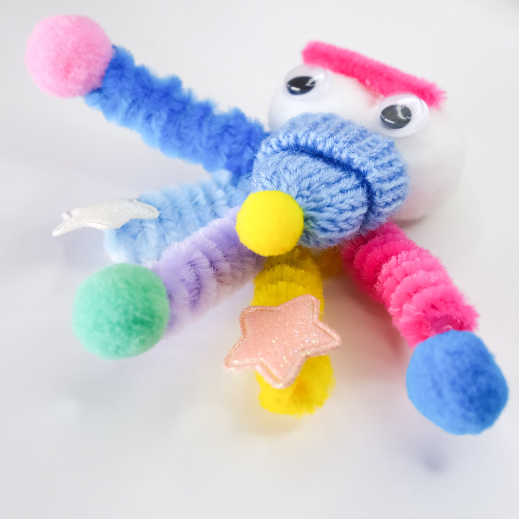 - Vibrant chenille pipe cleaner arms with pom-pom tips and glittery stars