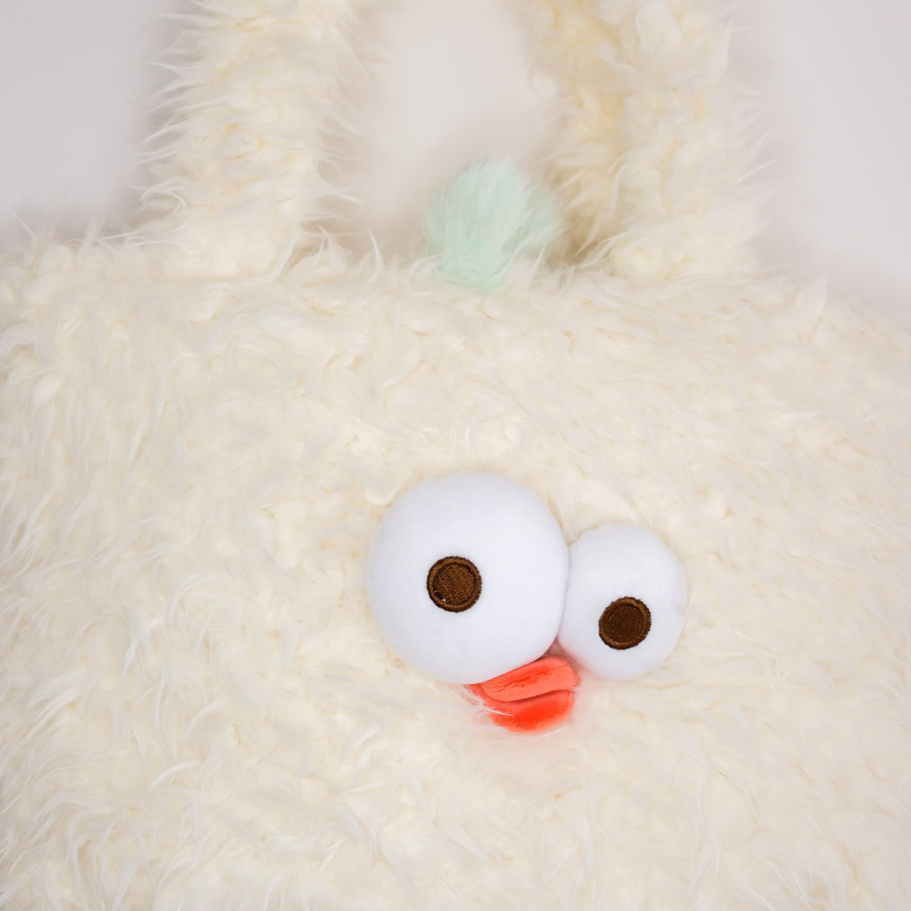 - Eye-catching white rooster design with fluffy texture and vibrant, embroidered facial features