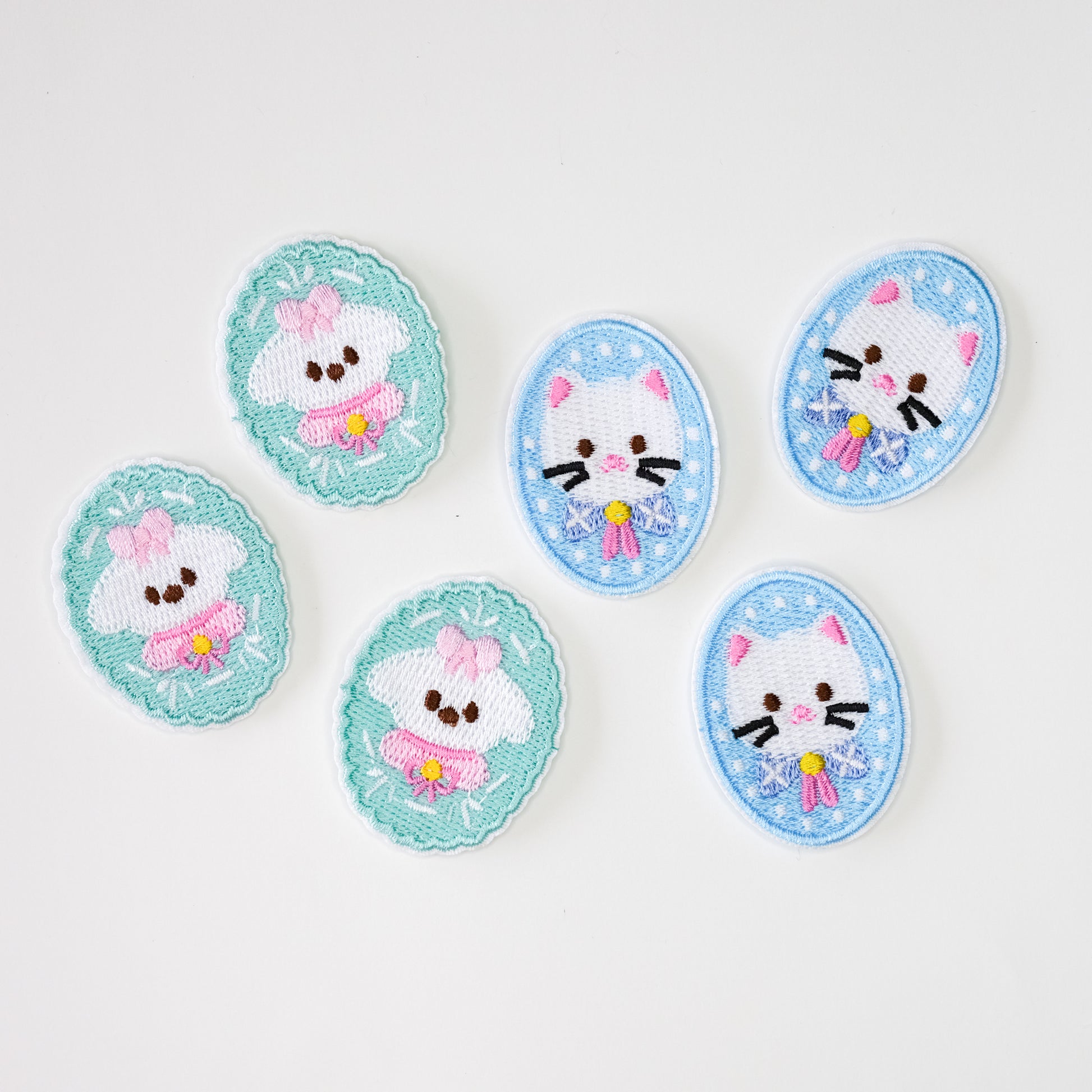 Charming and composed, our little white kitten sits sweetly within a sky-blue polka dot frame, dressed with a lavender bow and golden charm. This embroidered iron-on patch brings a soft touch of nostalgia and feline grace to your favourite outfits and accessories.
