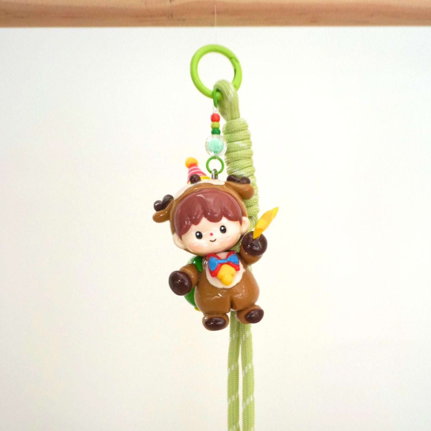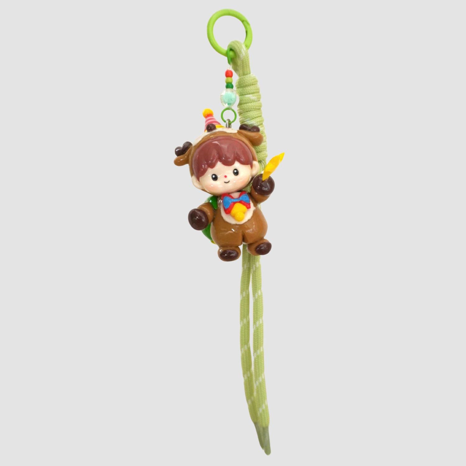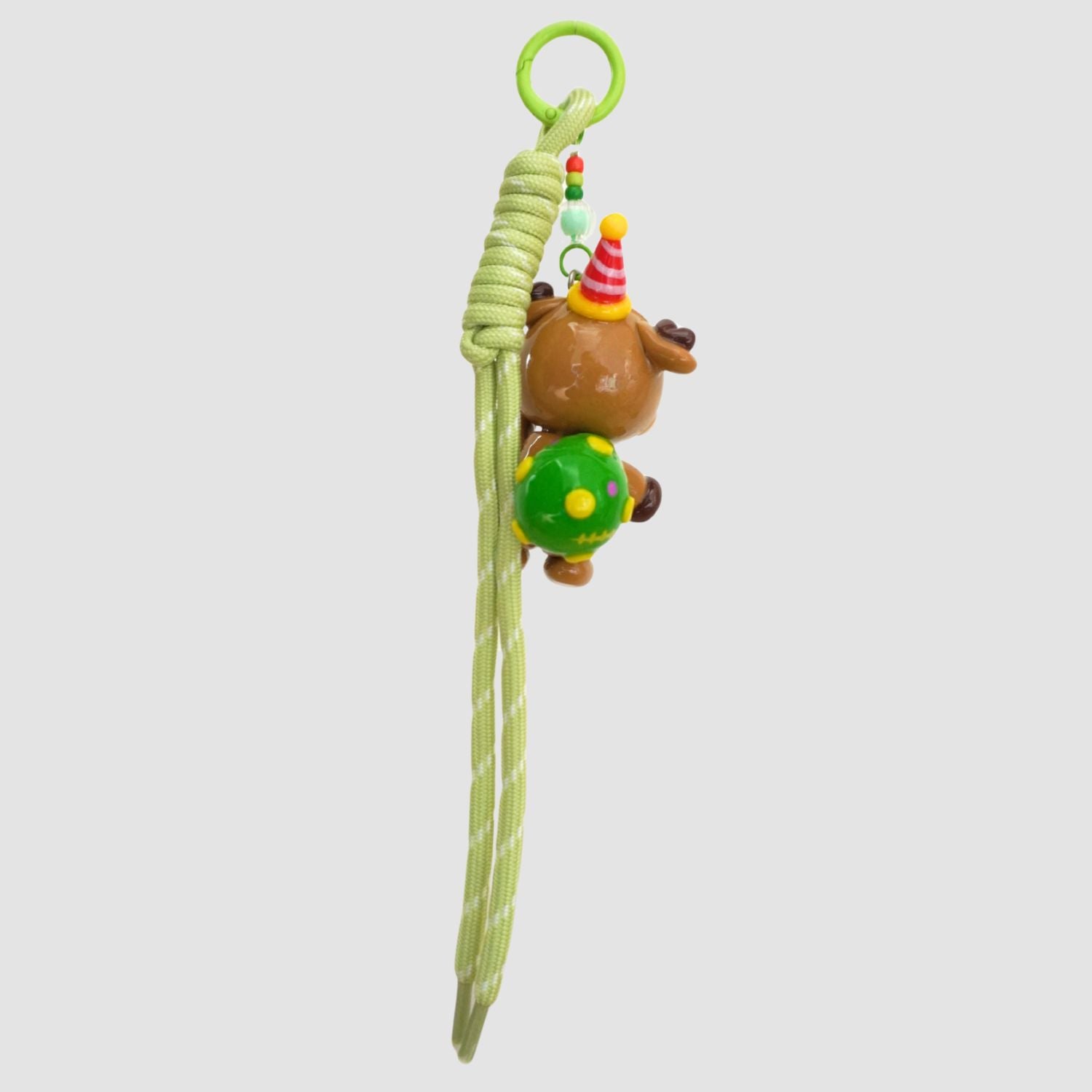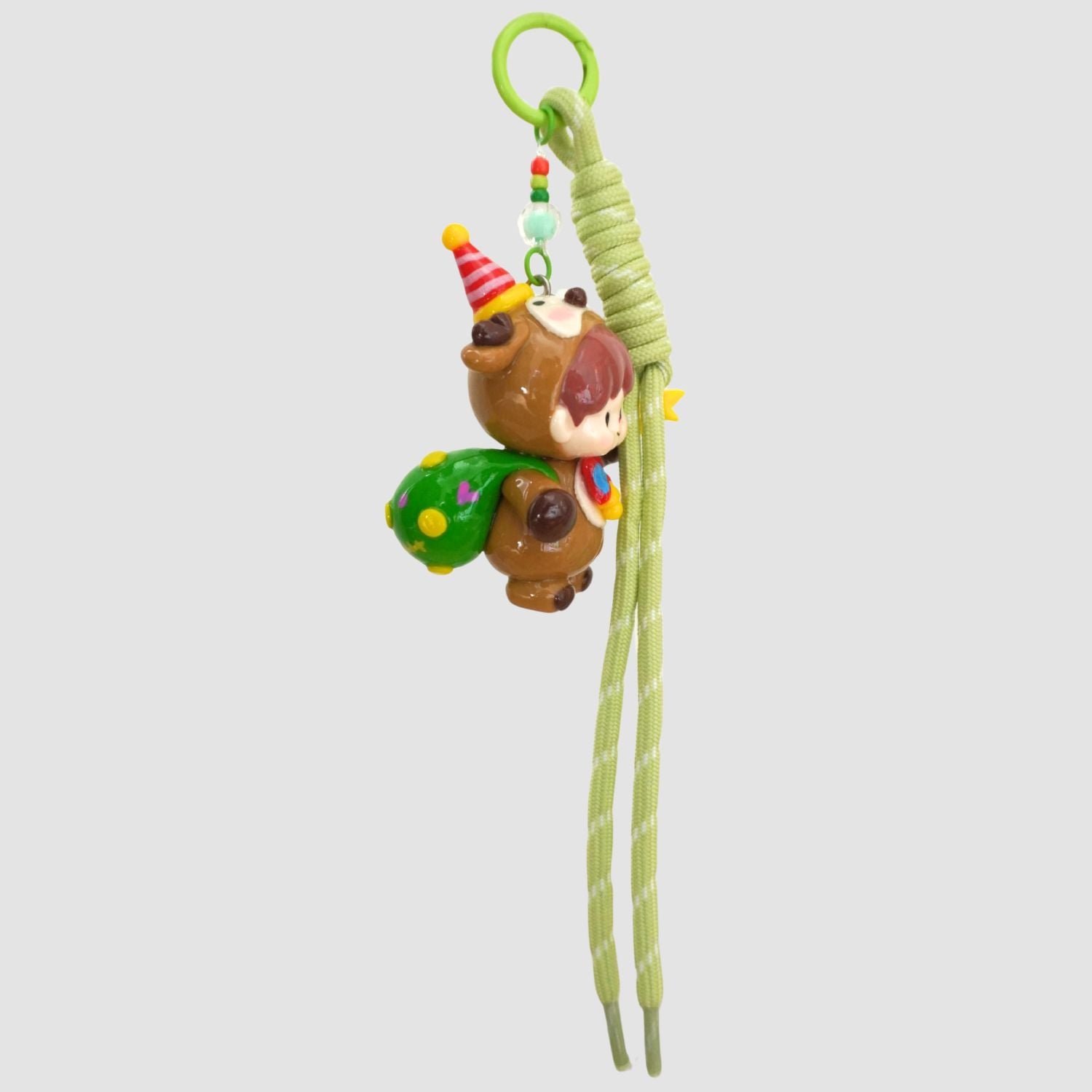 Each piece comes with a metal clasp and matching green rope strap, making it perfect as a bag charm or keychain. Its carefully sculpted details and hand-painted finish bring warmth and cheer wherever it goes.