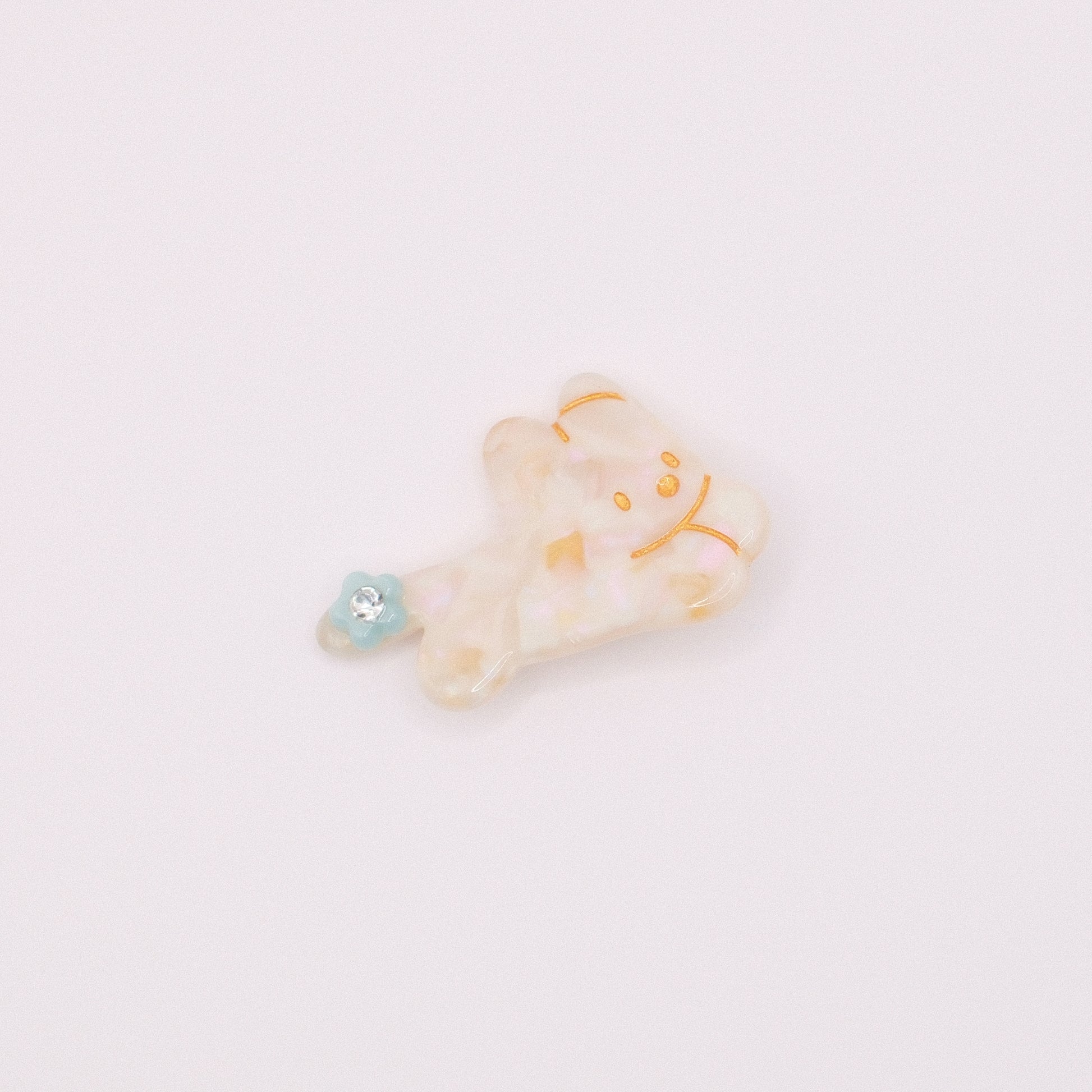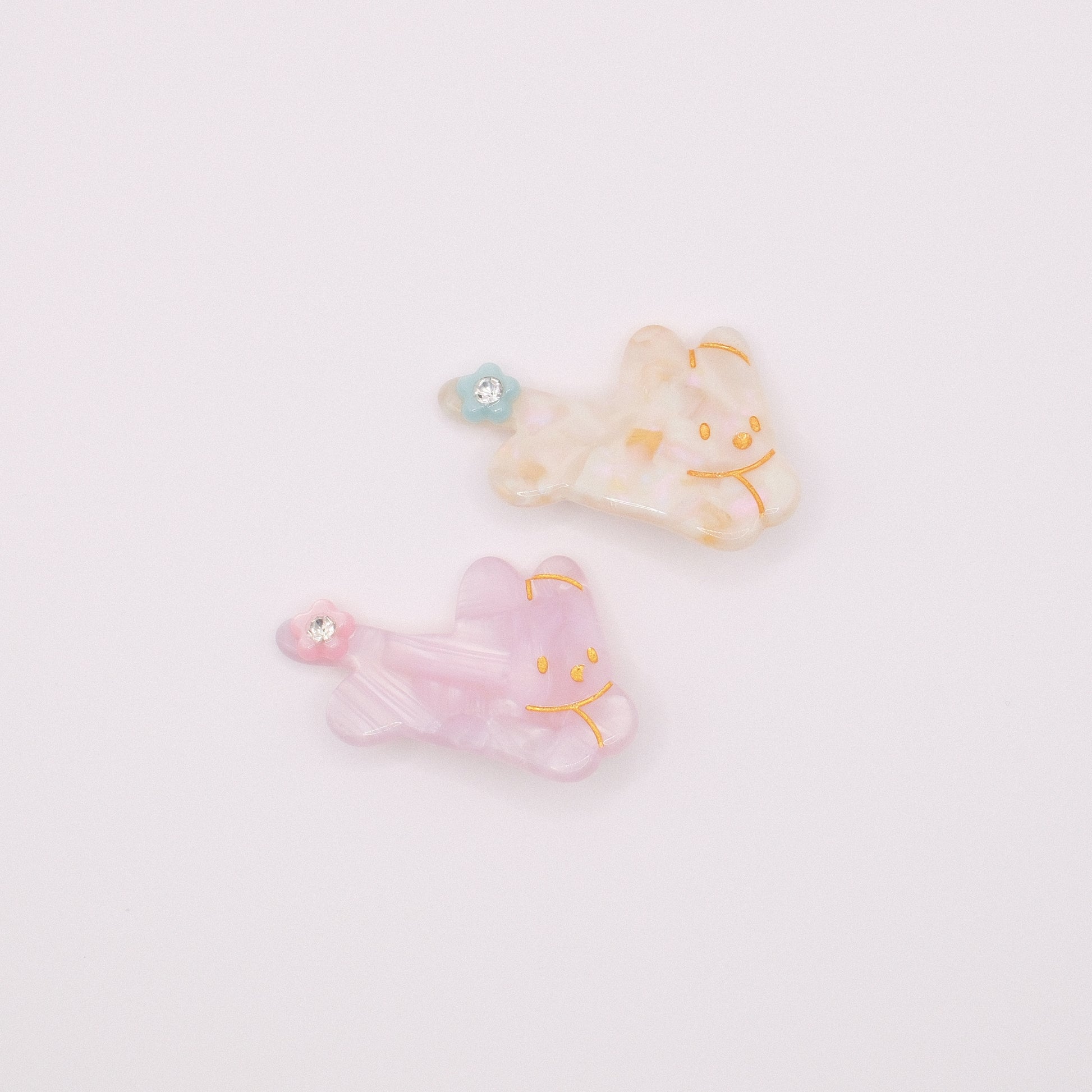 Soft, dreamy, and sweetly whimsical — this Cream Rabbit Hair Clip brings a touch of pearly magic to your hairstyle. Made with a marbled iridescent finish, it features a smiling bunny outline in delicate gold detailing and a tiny blue flower with a sparkling gem center for the perfect hint of shimmer.