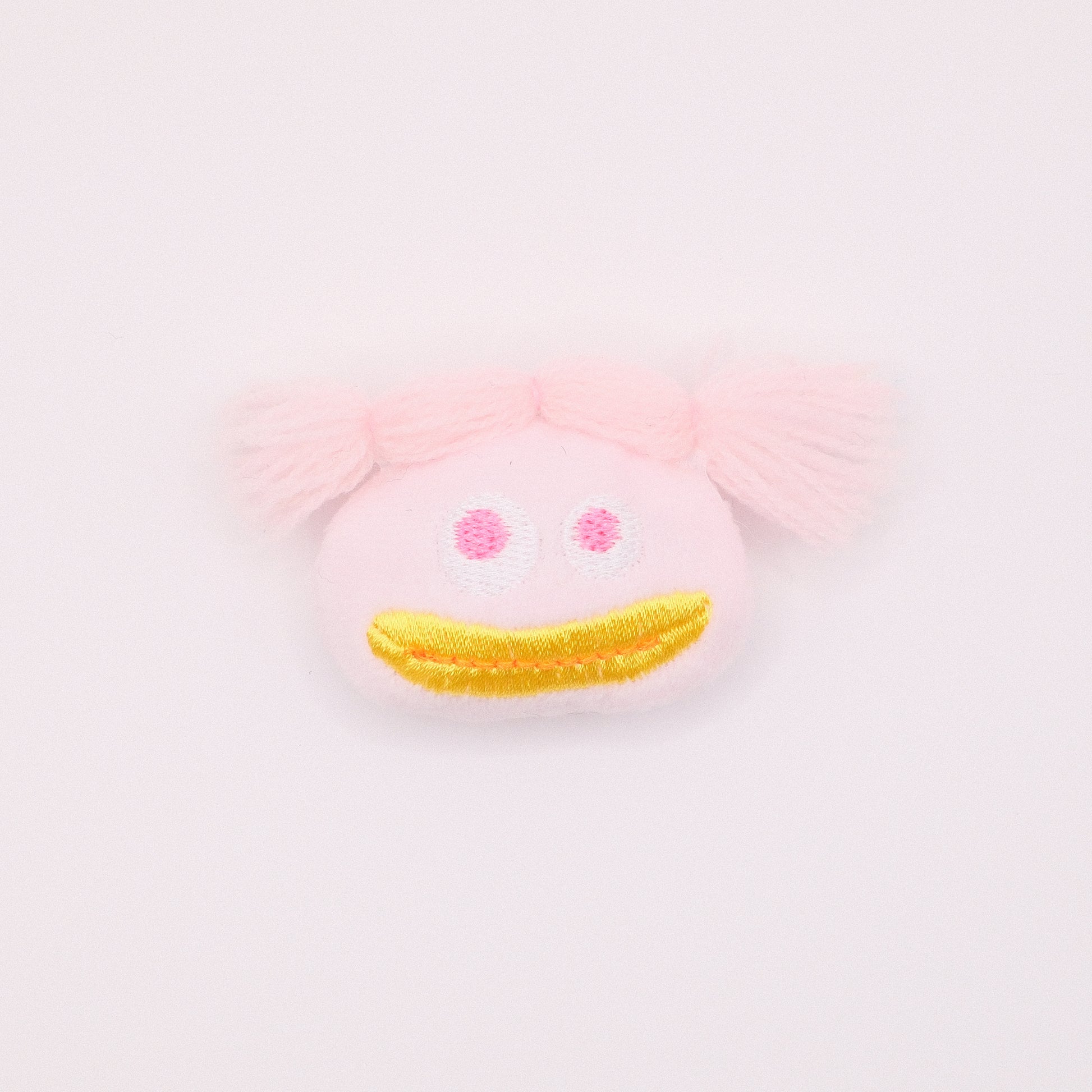 Sweet on the outside, sassy on the inside—Cheeky Cherry is all about playful mischief. With her bubblegum-pink face, matching pigtails, rosy eyes, and a shiny embroidered golden grin, she’s the brooch that keeps you guessing.