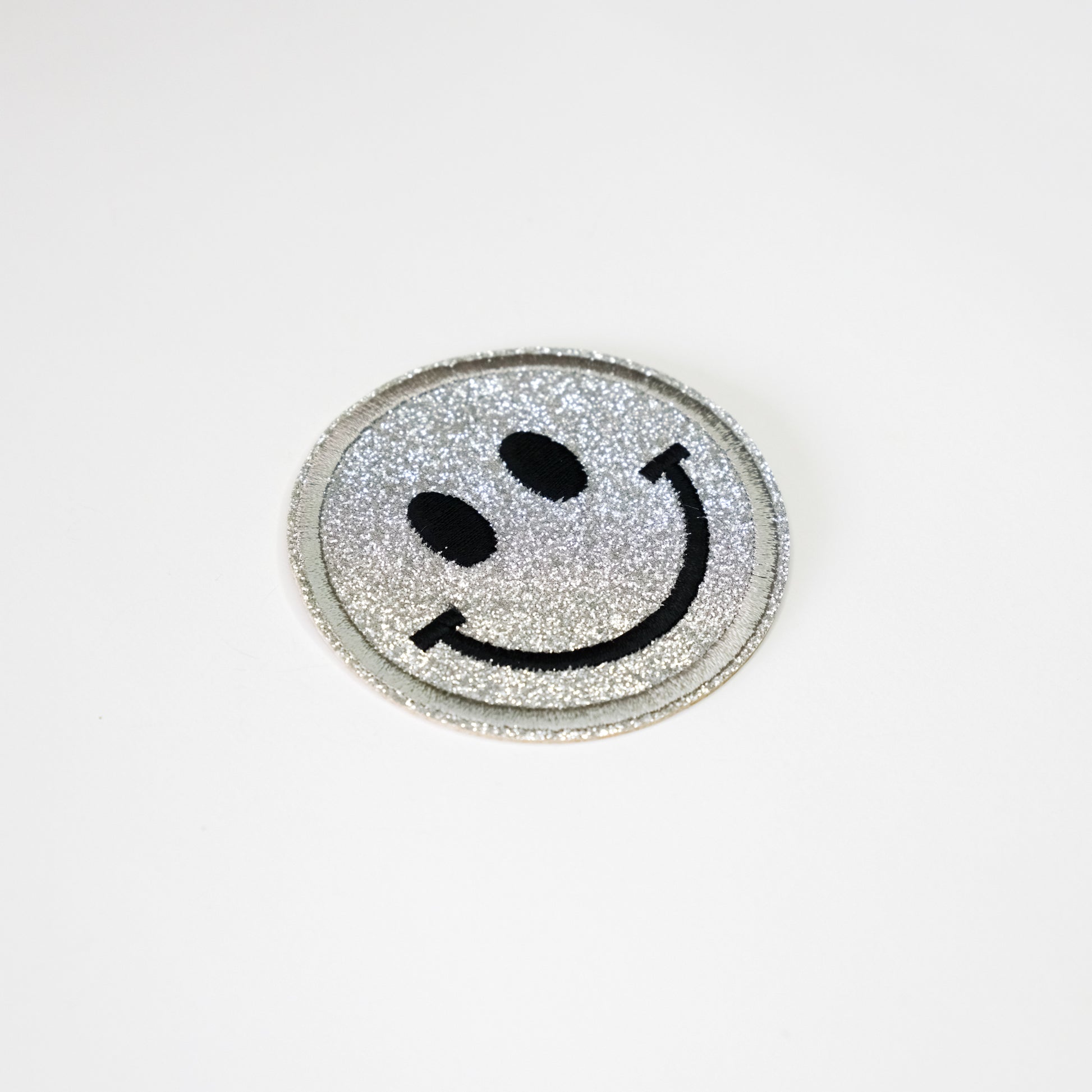 - Embroidered patch featuring a smiley face with full silver glitter coverage