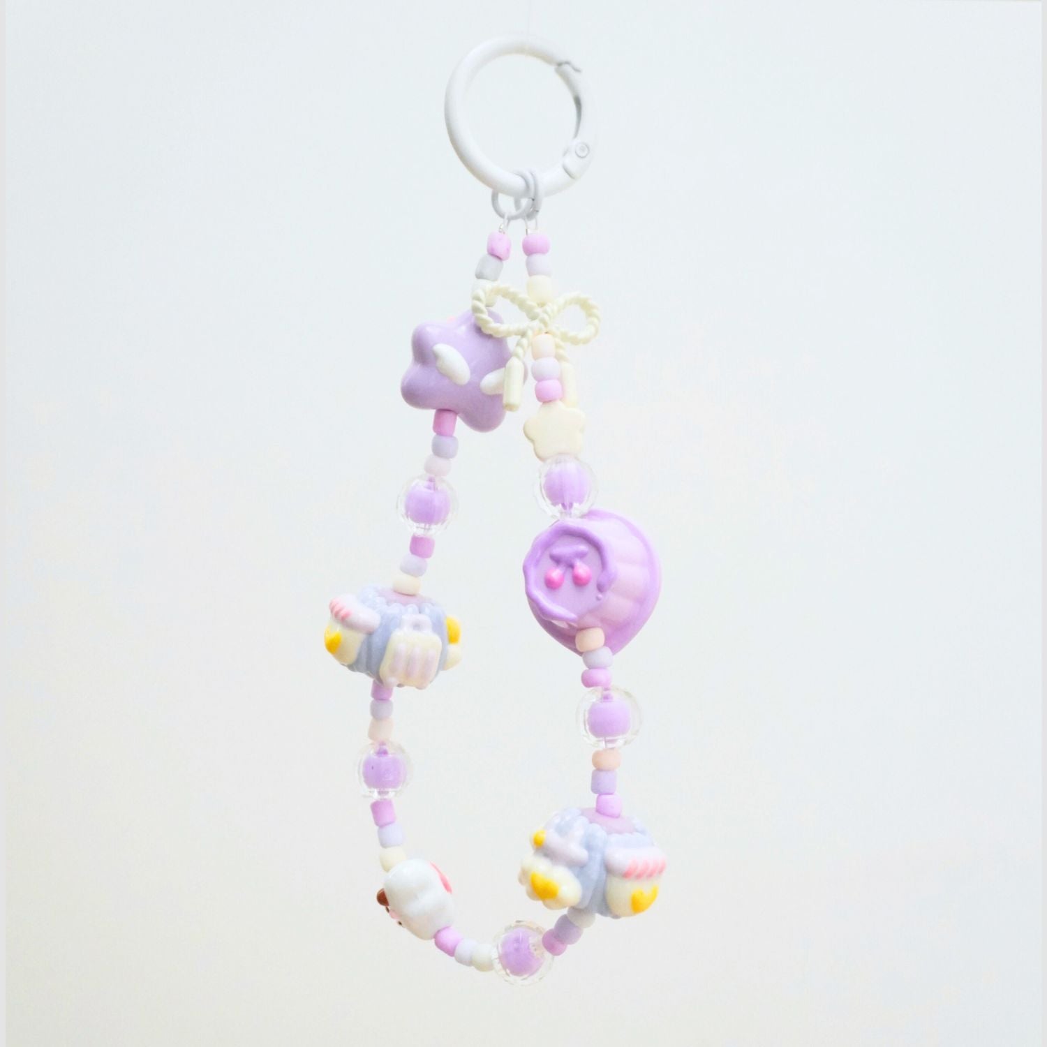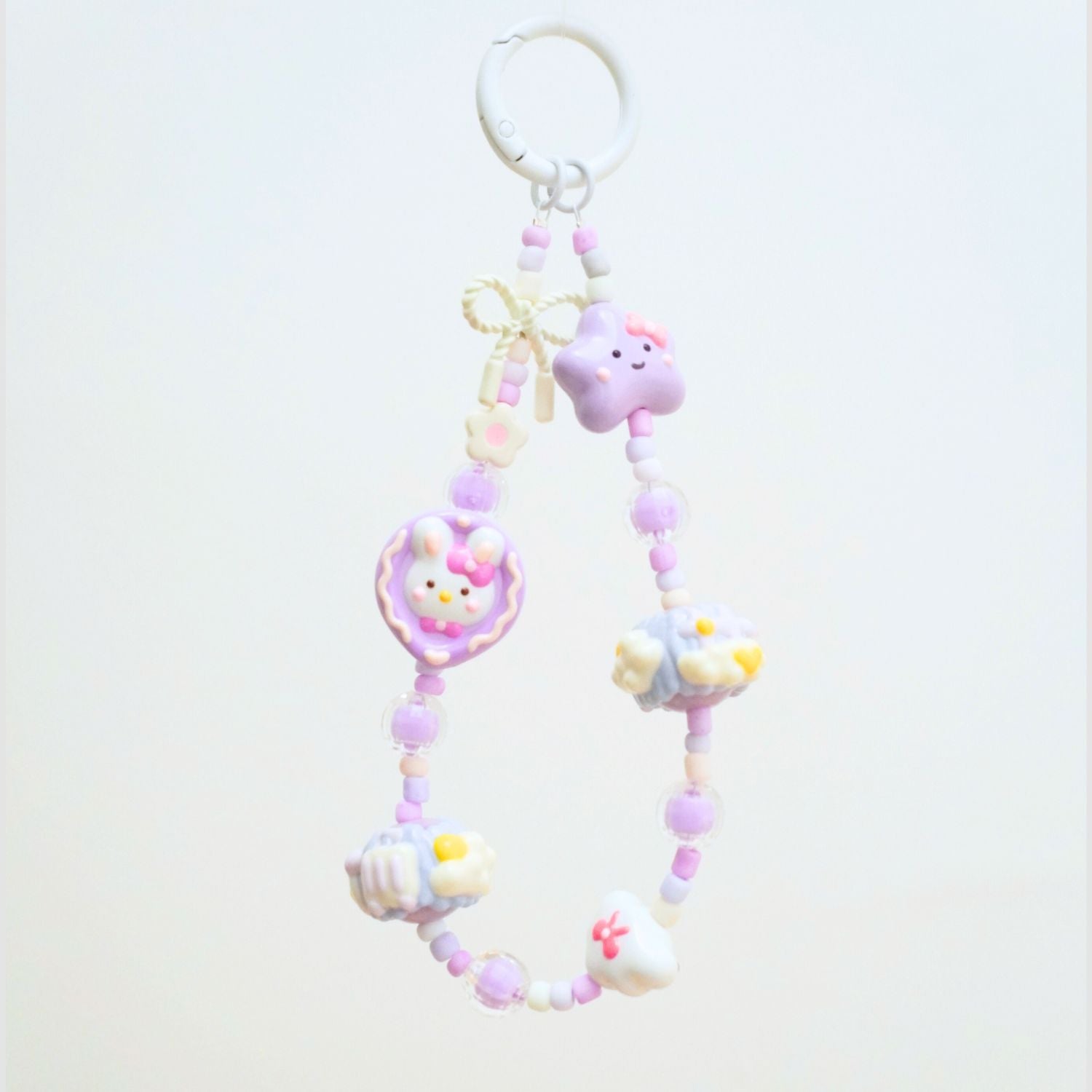This strap features a charming bunny cookie charm surrounded by mini pastel beads, stars, and cupcake-inspired details. A tiny ribbon bow adds the final touch of whimsy, making it a must-have for lovers of gentle, kawaii aesthetics.