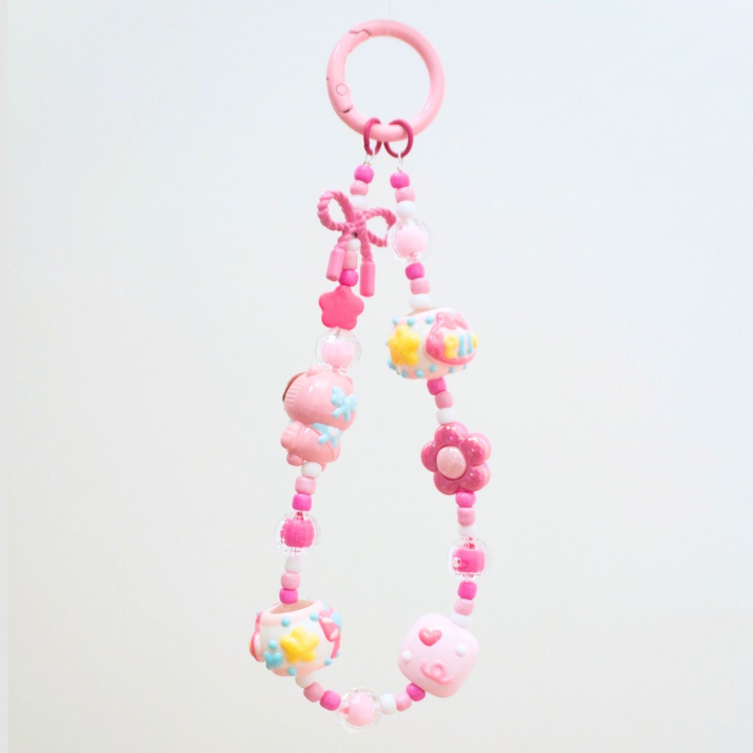 Designed in-house, this strap features an assortment of pastel pink beads, mini charms, and playful accents ā from bows to tiny figures and candy-inspired details. The soft pink tones blend perfectly for a dreamy, kawaii aesthetic that matches any phone case or accessory.